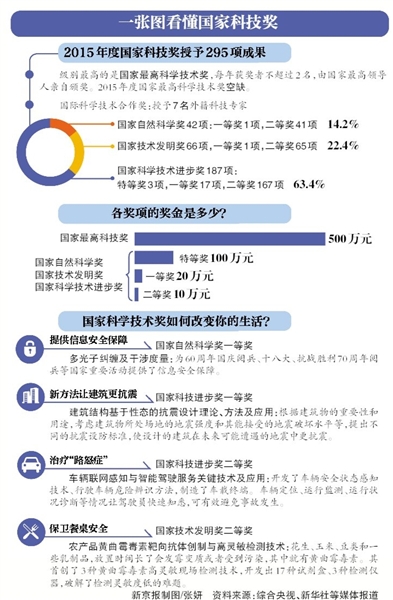 2015年度国家科学技术奖共授予295项科研成果,较2014年减少了23项,受理项目和评审通过项目总数比2011年减少了21%,其中进步奖减少了近100项,这些都顺应了目前国家科技奖励“提高质量、减少数量、优化结构、规范程序”的改革要求。 2015年度的评选,政策导向上继续突出对青年人才和创新团队的奖励。自然科学奖连续3年为40岁以下青年科技人才开辟不受指标限制的推荐渠道。全部获奖项目中,第一完成人的平均年龄为54.3岁,主要完成人的平均年龄为47.6岁。
