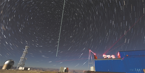 在西藏阿里观测站,“墨子号”量子科学实验卫星过境,科研人员在做实验(合成照片)。