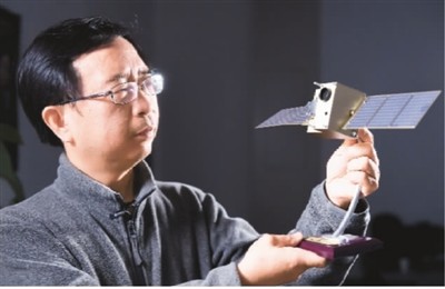 中科院院士潘建伟在办公室内与“墨子号”量子卫星模型合影。 新华社记者 张 端摄