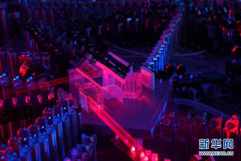 这是光量子干涉实物图:左下方为输入光学部分,右下方为锁相光路,上方共输出100个光学模式,分别通过低损耗单模光纤与100超导单光子探测器连接。新华社发