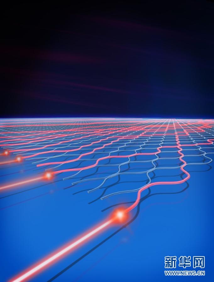 这是100模式相位稳定干涉仪:光量子干涉装置集成在20cm*20cm的超低膨胀稳定衬底玻璃上, 用于实现50路单模压缩态间的两两干涉,并高精度地锁定任意两路光束间的相位。新华社发