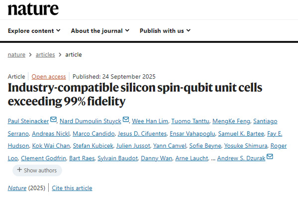 相关研究论文于9月24日在以“Industry-compatible silicon spin-qubit unit cells exceeding 99% fidelity(工业生产的硅自旋量子比特单元保真度超过 99%)为题发表在国际学术期刊《自然》(Nature)上。
