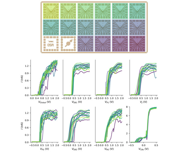 图2:比利时微电子研究中心(IMEC)生产的来自同一晶圆的16组量子点器件的栅极开关特性(EB1, P1, J, P2, EB2, RG, CBs)。在1开尔文探针台测试中均表现出非常一致的开关曲线。