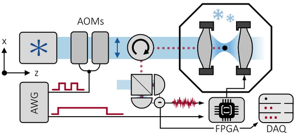 对此,本研究采用了光镊(聚焦的激光束)将一个直径100纳米、质量约1.18飞克(fg)的二氧化硅纳米球捕获在温度低至7开尔文(K)的超高真空腔内。