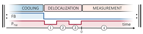 他们首先通过反馈冷却技术,将纳米球沿z轴的运动冷却到非常接近其量子基态(平均声子数 n̄ ≈ 0.68,意味着主要处于基态,仅有轻微残留热能)的程度。在此状态下,其位置不确定性约为17皮米(pm),相干长度 ξ₀ ≈ 21 pm。离域化方案关键的一步是,他们采用了精确计时的激光脉冲序列来快速调制光学陷阱。通过突然两次降低激光功率(脉冲1和脉冲3),降低了振荡频率。并且在两个脉冲之间加入四分之一振荡周期的延迟(步骤2),有助于抵消由杂散力引起的动量冲击。