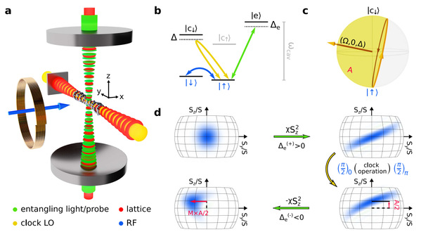 标准量子极限来自于量子力学的概率性基本原理,突破这一极限需要将光晶格中大量原子纠缠在一起,同时保证纠缠态寿命和探测精度,但在实验上难以实现。最近,有研究已在GHZ纠缠态上已实现低于SQL的频率稳定度[2,3,4],但难以规模化。另一方面,自旋压缩态有望被用于突破SQL,相对GHZ态,它的相干时间更长,但难点在于态探测需要达到低于量子投影噪声级别的分辨率。