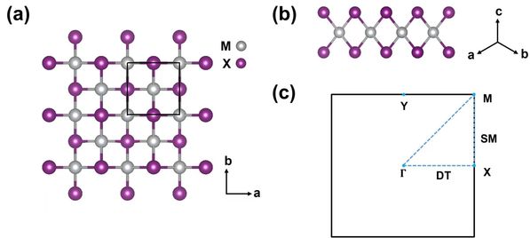 图(1):(a)单层M2X2的俯视图,(b)侧视图,以及(c)其布里渊区示意图。