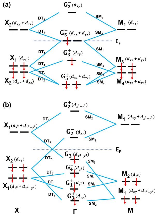 团队结合DFT计算与紧束缚模型,系统分析了单层M2X2材料的拓扑性质,阐明了其不同拓扑陈数的内在物理起源。研究表明,费米能级附近的3d轨道构成及其对应的对称性表示的差异,会导致两类本质不同的能带反转机制,从而形成不同的拓扑陈数与拓扑相。