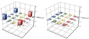 利用量子层析技术构建的存储前(a和b)后(c和d)的纠缠态密度矩阵