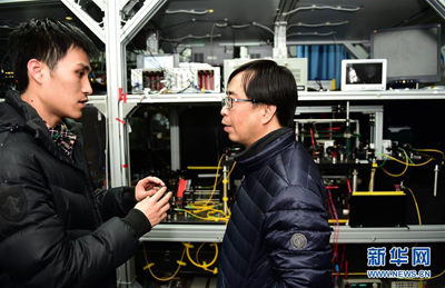 2月25日,潘建伟(右)在中国科学技术大学一实验室内了解科研情况。