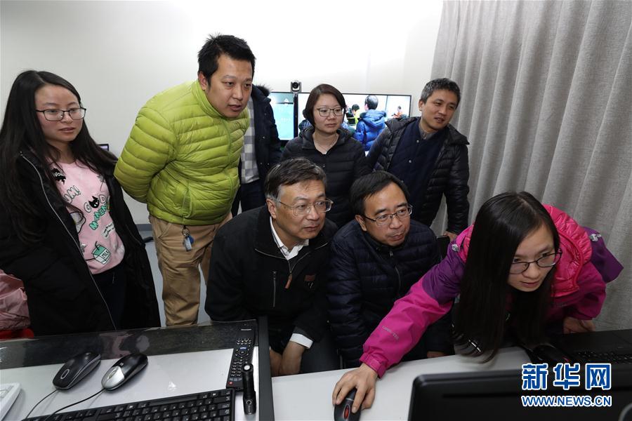 在云南丽江观测站,潘建伟(前排右二)、王建宇(前排左一)、彭承志(后排右一)等科研人员在做实验(2016年12月22日摄)。