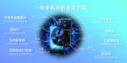其实,从日常使用的一部手机里,就可以看到很多与量子力学相关的基础研究成果。有人统计,共有八项诺贝尔奖成果在手机里面:半导体器件是2009年诺贝尔物理学奖、集成电路是2000年诺贝尔物理学奖……(见下图)