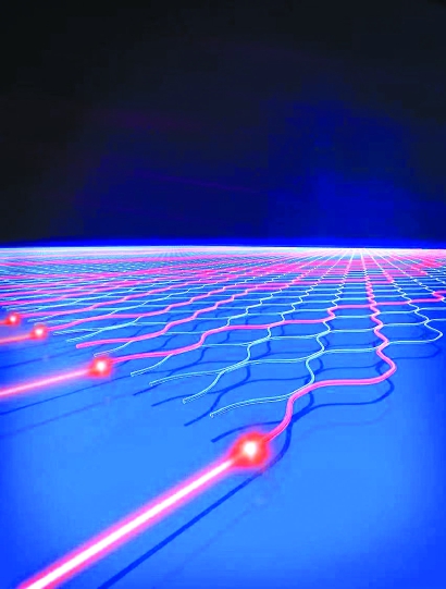 100模式相位稳定干涉仪 光量子干涉装置集成在20cm×20cm的超低膨胀稳定衬底玻璃上,用于实现50路单模压缩态间的两两干涉,并高精度地锁定任意两路光束间的相位马潇汉 梁竞 邓宇皓 摄