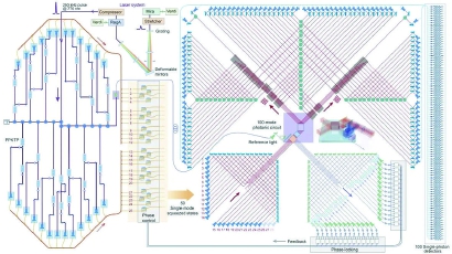 “九章”量子计算原型机光路系统原理图 左上方激光系统产生高峰值功率飞秒脉冲;左方25个光源通过参量下转换过程产生50路单模压缩态输入到右方100模式光量子干涉网络;最后利用100个高效率超导单光子探测器对干涉仪输出光量子态进行探测 制图:陆朝阳 彭礼超