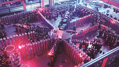 这是光量子干涉实物图:左下方为输入光学部分,右下方为锁相光路,上方共输出100个光学模式,分别通过低损耗单模光纤与100超导单光子探测器连接 (新华社发)