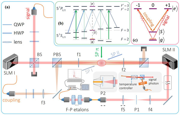史保森、丁冬生领导的科研团队利用铷冷原子体系,基于光子轨道角动量自由度,开展了高维多模光子态的长时间存储研究,取得重要进展。在本工作中,团队通过操控极化磁场压制空间模式的横向消相干、并通过制备磁不敏感态进一步延长存储时间(如图1所示)。团队将带有时序控制的反向泵浦光的热原子池作为窄带滤波器,实现了对单光子量级信号光的滤波和探测。