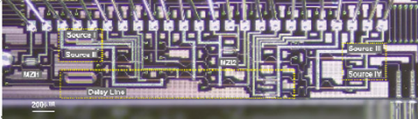 量子干涉是众多量子应用的基础,特别是近年来基于路径不可区分性产生的非线性干涉过程越来越引起人们的关注。尽管双光子非线性干涉过程已经实现了二十多年,并且在许多新兴量子技术中得到了应用,直到2017年人们才在理论上将该现象扩展到多光子过程,但实验上由于需要极高的相位稳定性和路径重合性需求,一直未获得新的进展。光量子集成芯片,以其极高的相位稳定性和可重构性逐渐发展成为展示新型量子应用、开发新型量子器件的理想平台,也为多光子非线性干涉研究提供了实现的可能性。任希锋研究组长期致力于硅基光量子集成芯片开发及相关应用研究并取得系列重要进展:(1)国际上首次基于硅基光子集成芯片实现了四光子源的制备(Light Sci Appl 8, 41, 2019);(2)首次实现频率兼并四光子纠缠源制备(npj Quantum Inf 5, 90, 2019);(3)首次实现波导模式编码的量子逻辑门操作(Phys. Rev. Lett. 128, 060501,2022)和超紧凑量子逻辑门操作(Phys. Rev. Lett., 126, 130501, 2021)等。在这些工作基础上,研究组同MarioKrenn教授合作,通过进一步将多光子量子光源模块、滤波模块和延时模块等结构进一步片上级联,在国际上首次展示了四光子非线性产生过程的相干相长、相消过程。实验结果如图1(a)所示,四光子干涉可见度为0.78。而双光子符合并未观测到随相位的明显变化,这同理论预期一致。整个实验在一个尺寸仅为3.8×0.8mm2的硅基集成光子芯片上完成,如图1(b)所示。