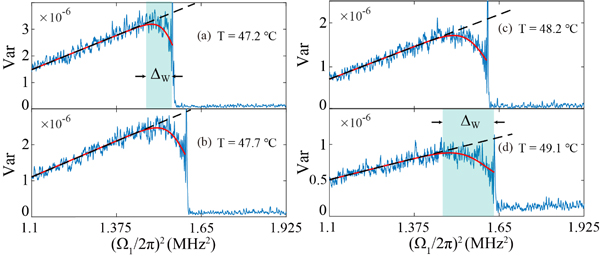 图 1 :物理模型图。(a)为相变示意图。(b)为双音驱动两个里德堡态的能级示意图。(c)为里德堡原子系统的相变。(d)为双音微波驱动下的电磁诱导透明(EIT)谱线。(e)是通过计算图d中谱线的方差得到。在系统接近临界点时,方差表现出非线性行为,这一行为可作为临界点前的早期预警信号。