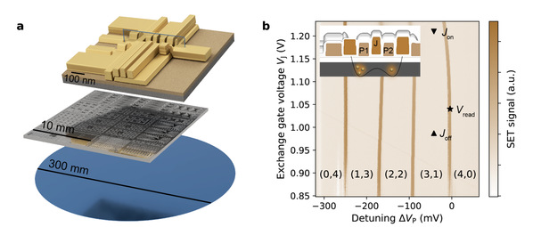 图1:a,在 300 毫米晶圆上制造的 Diraq 双量子比特器件的示意图,从下到上显示了整片晶圆、单芯片和单器件的层级结构。b,器件A的电荷稳定性图以及参数设定点:单比特门(Joff < 1 千赫兹,三角形)、双比特门(Jon ≈ 1 兆赫兹,倒三角)和读出(星形)。