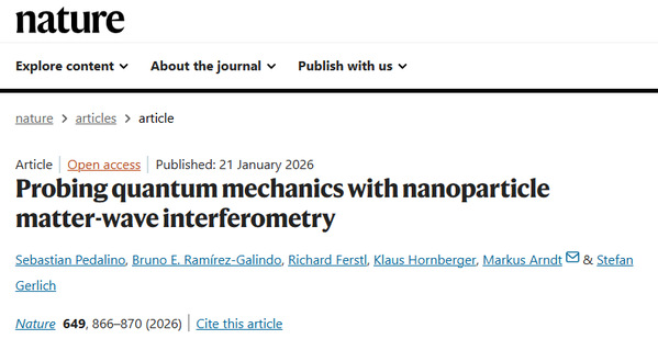 [1]. Pedalino, S., Ramírez-Galindo, B.E., Ferstl, R. et al. Probing quantum mechanics with nanoparticle matter-wave interferometry. Nature 649, 866–870 (2026).