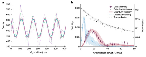 左:实验观测到的干涉条纹;右:数据点与量子(蓝色)、经典(蓝色)预言的对比 @原论文