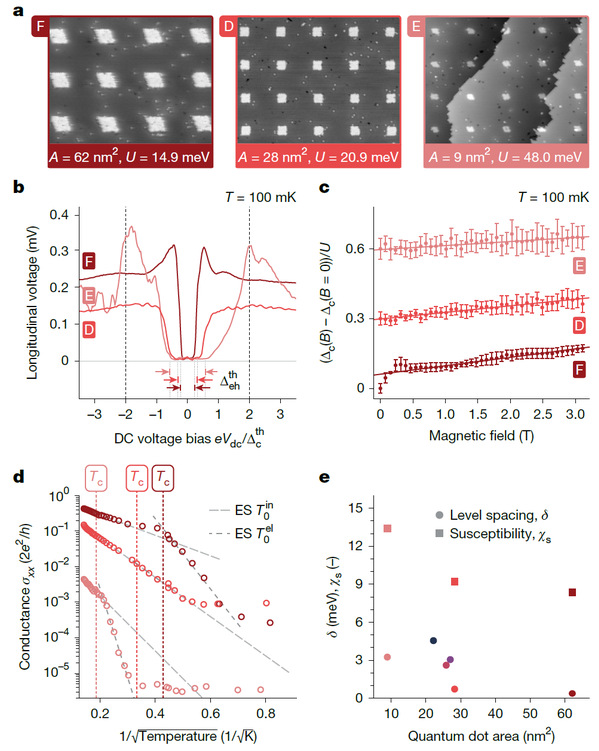 通过不同间距的阵列设计,相互作用强度U实现了连续调节。对于间距较小的阵列,电子动能占据主导,系统在低温下保持高电导率,表现为金属行为;而对于间距较大的阵列,电子间的排斥力战胜了动能,电子局域在各自的格点上,电导率随降温下降,表现为绝缘体行为。