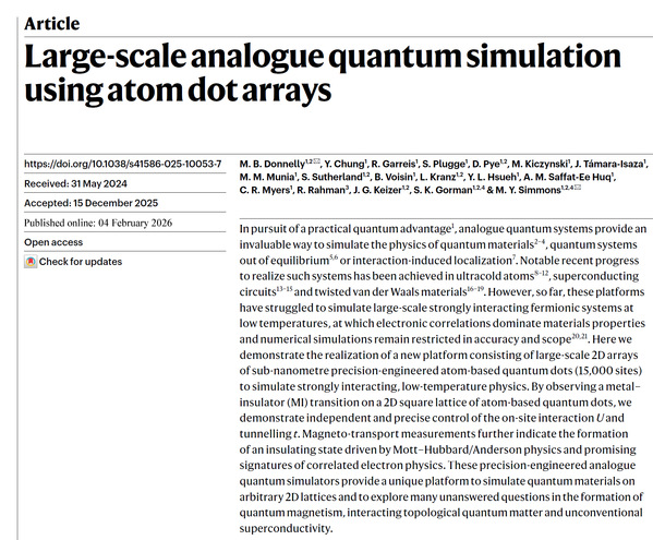 模拟低温下的强关联费米子系统一直是凝聚态物理领域的重大挑战。为了突破经典计算的瓶颈,澳大利亚新南威尔士大学(UNSW)Michelle Simmons团队开发了一种基于硅基原子量子点的大规模量子模拟器。利用扫描隧道显微镜(STM)直写技术,该工作成功构建了包含1.5万个量子点的二维阵列,并实现了对费米-哈伯德模型核心参数(如隧穿能和库仑相互作用)的精确调控。实验不仅清晰复现了由相互作用驱动的金属-绝缘体相变,还在绝缘态中观测到了电子交换相互作用增强及霍尔效应异常,揭示了潜在的强关联电子行为,为大规模量子模拟、探索高温超导与量子磁性提供了全新平台。该成果于2月4日发表在国际权威学术期刊《Nature》上。
