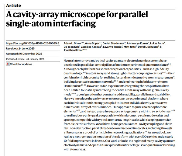 [1] Shaw, A.L., Soper, A., Shadmany, D. et al. A cavity-array microscope for parallel single-atom interfacing. Nature (2026). https://doi.org/10.1038/s41586-025-10035-9