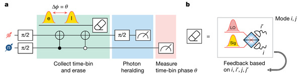 光子模式擦除(Mode Erasure):通过将入射信号与本振(LO)相干光在分束器上混合,并根据探测结果进行反馈操作,成功擦除了光子的空间/时间路径信息,从而保留了相位差。
