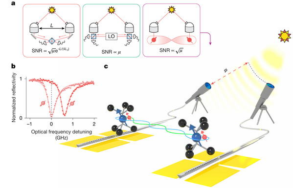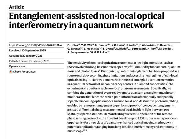 近期,哈佛大学Mikhail Lukin教授团队及其合作者在量子网络与精密测量领域取得了突破性进展。该团队利用集成在金刚石纳米腔中的硅空位色心(SiV)量子存储器,在实验室模拟的弱相干光源条件下成功构建了一个新型量子增强干涉测量系统。这项工作在实验室内通过引入总长度为1.55公里的光纤验证了高保真非局域相位测量的可行性,这一长度已达到目前最先进光学望远镜阵列基线长度的5倍。这不仅标志着基于量子网络的分布式传感技术迈向实用化,也为未来构建超长基线量子望远镜阵列、实现深空光学探测和高灵敏生物显微成像提供了关键的实验依据。相关论文于2月25日以“Entanglement-assisted non-local optical interferometry in a quantum network”为题发表在国际权威学术期刊《自然》(Nature)。
