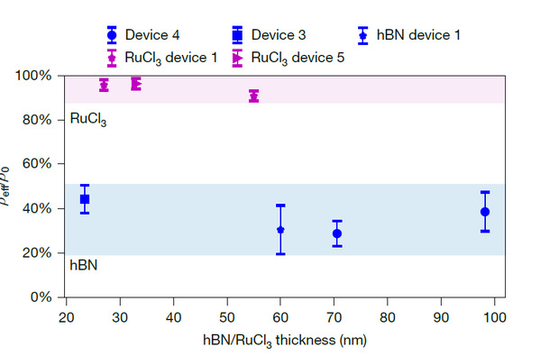 在低温实验环境中,研究团队利用磁力显微镜直接测量了材料表面的迈斯纳效应。磁力显微镜通过悬臂末端的磁性探针在样品上方振荡,当探针靠近超导体时,超导体内产生的迈斯纳抗磁超导电流会形成反向磁场,对探针产生排斥力,引起悬臂振动频率的偏移。通过测量这种局部力梯度,研究人员计算了材料局域的超流体密度。探测结果显示了不同区域的信号差异。在未覆盖物质的 κ-ET 表面,探针记录到了迈斯纳排斥力信号。当探针扫描进入被 hBN 覆盖的区域时,迈斯纳排斥力发生减弱。为了验证这种腔体效应的稳健性并量化其影响,研究人员测试了不同厚度(涵盖 25 nm 到 110 nm 范围)的 hBN 晶片。定量物理模型分析表明,在 hBN 双曲模式调控的界面下方,分子超导体的局域超流体密度被抑制了约百分之五十以上。相比之下,当探针移动到覆盖有非共振材料 RuCl3 的界面区域时,测量到的迈斯纳力信号与裸露的 κ-ET 区域接近。在被 hBN 覆盖的高温超导体 BSCCO 体系中,超导性质未发生明显的改变。