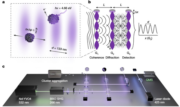 本实验里160,000 Da的钠团簇在实验速度下的德布罗意波长仅为皮米(10-12 m)量级,比团簇自身的几何直径还要小得多。要在如此微小的波长下观测到相干效应,实验装置必须要保持极高的稳定性。