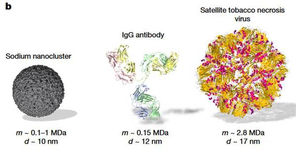 钠团簇、IgG抗体、卫星病毒 尺寸比较 @原论文
