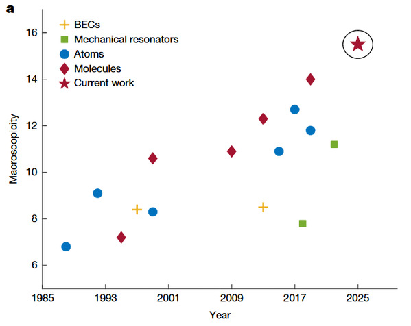 宏观性(Macroscopicity)对比图。本次实验(红星)超过以往所有物质干涉实验 @原论文