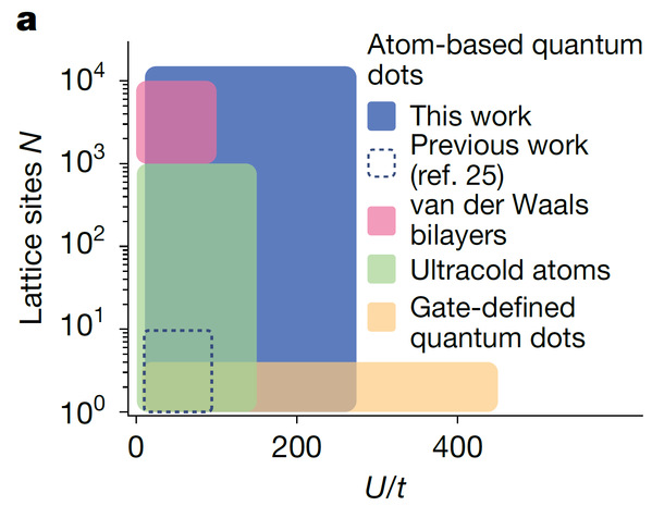 然而,不同的平台在性能参数上占据着不同的位置。如图1所揭示的,衡量一个量子模拟器的核心指标通常包括模拟规模(晶格点数(N)和相互作用强度(U/t)。超冷原子平台虽然能构建成千上万个格点,但在模拟低温下的强关联费米子系统时受到一定限制;而传统的栅控量子点虽然能实现较强的相互作用,但在扩展到大规模阵列方面存在技术挑战。