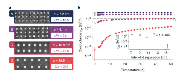通过不同间距的阵列设计,相互作用强度U实现了连续调节。对于间距较小的阵列,电子动能占据主导,系统在低温下保持高电导率,表现为金属行为;而对于间距较大的阵列,电子间的排斥力战胜了动能,电子局域在各自的格点上,电导率随降温下降,表现为绝缘体行为。
