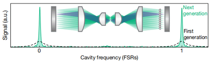 论文中还展示了最新的下一代设计原型。该设计用第二个4f望远镜和平面端镜取代了弯曲端镜,消除了第一代中因镜面反射导致的模式空间反转和双陷阱问题。在真空外测试中,实现了超过500个可分辨的腔,平均精细度提升至110(相比第一代提升超8倍),其中超过400个腔能在优化线宽内保持简并。预计优化后,整个阵列的并行成像时间可缩短至100微秒以下。