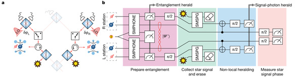 为了突破这一局限,理论物理学家曾提出利用量子网络来“远程传送”电磁场量子态。通过预先生成的量子纠缠,可以在不获取“路径信息”的情况下探测信号光子的到达,从而过滤掉无用的真空涨落。