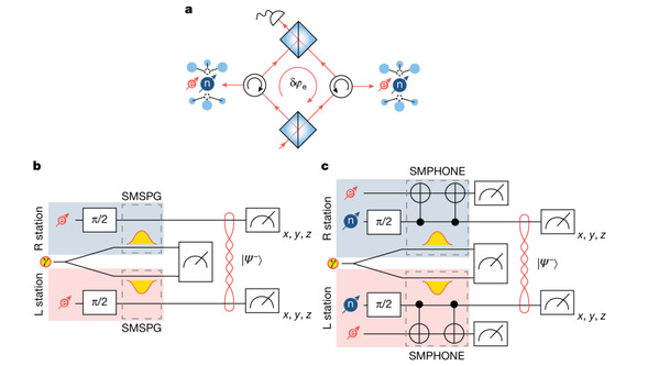 非破坏性光子预报(Non-destructive Heralding):利用核自旋存储器保存相位,并通过两个站点中电子自旋的奇偶校验测量,在不破坏相位信息的前提下,“预报”信号光子的捕获情况。