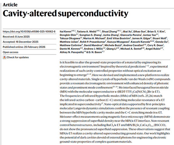 腔量子电动力学主要研究受限光学谐振腔内电磁场的量子涨落与物质体系之间的相互作用。近年来,物理学家正尝试将这种真空调控手段引入凝聚态物理领域,以此来影响甚至改变材料的宏观属性。六方氮化硼( hBN )因其各向异性的双曲色散性质,被用于构建特定频率的红外电磁谐振腔。其双曲模式引发的光子模式密度增强,恰好与分子超导体 κ-ET 内部的碳-碳化学键拉伸振动频率相匹配。近期,美国哥伦比亚大学 D. N. Basov 团队通过将hBN覆盖于 κ-ET 表面并利用磁力显微镜探测超导态。在无外部光子注入的条件下,实验表明电磁零点能涨落改变局域分子振动特性,导致材料的局域超流体密度被抑制约百分之五十。该项研究为调控材料的超导态提供了全新的实验手段,相关成果发表于国际权威学术期刊 《自然》[Nature 650, 864 (2026)]。