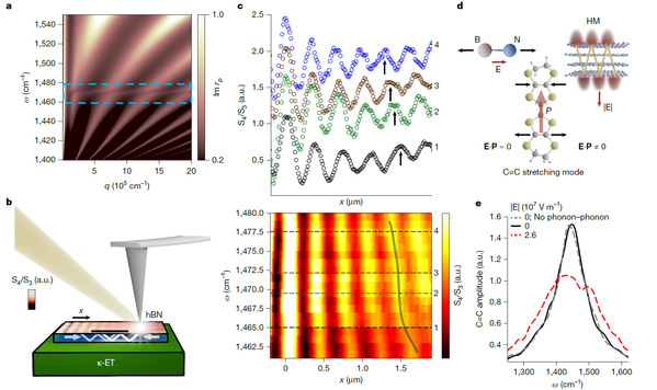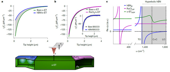 为了在实验上探究这一问题,研究人员需要寻找合适的红外微腔材料,并选定一个与特定化学键相关的超导体系。他们选择了分子超导体κ-(BEDT-TTF)2Cu[N(CN)2]Br (κ-ET) 作为研究对象。在κ-ET 的有机晶体结构中,其超导电性与分子内部具有红外活性的碳-碳拉伸振动模式存在关联。为了在纳米尺度实现对该振动频率的电磁共振匹配,传统的几何光学微腔会受到衍射极限的限制。研究团队采用了六方氮化硼( hBN )。作为一种层状范德华材料, hBN 在中红外频段表现出各向异性双曲色散物理性质,其面内和面外介电常数在特定频段内符号相反。这种双曲特性打破了传统光波传播的动量限制,使其能够支持具有大波矢的声子极化激元。这种极化激元将电磁能量局域在较小的空间体积内,从而在材料表面附近提供了局域电磁模式密度的增强。此外, hBN 的红外双曲模式所在的频段,覆盖并匹配了 κ-ET 分子内部的 C=C 键拉伸共振频率。因此,这片 hBN 晶片在超导体表面形成了一个无需外部光子注入的高态密度“暗腔”。