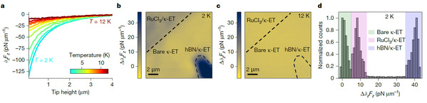 为了从热力学相变的角度进一步验证这一现象,研究团队进行了变温测试。随着环境系统的温度逐渐提升,并最终跨越 κ-ET 的超导临界温度(约 11.5 K )到达 12 K 的正常态时,磁力显微镜图像中 hBN 覆盖区域、RuCl3 覆盖区域与裸露超导区域之间的探测信号对比度消失。这种随温度相变而消失的信号差异表明,低温下观察到的抑制效应与材料的超导态具有相关性。